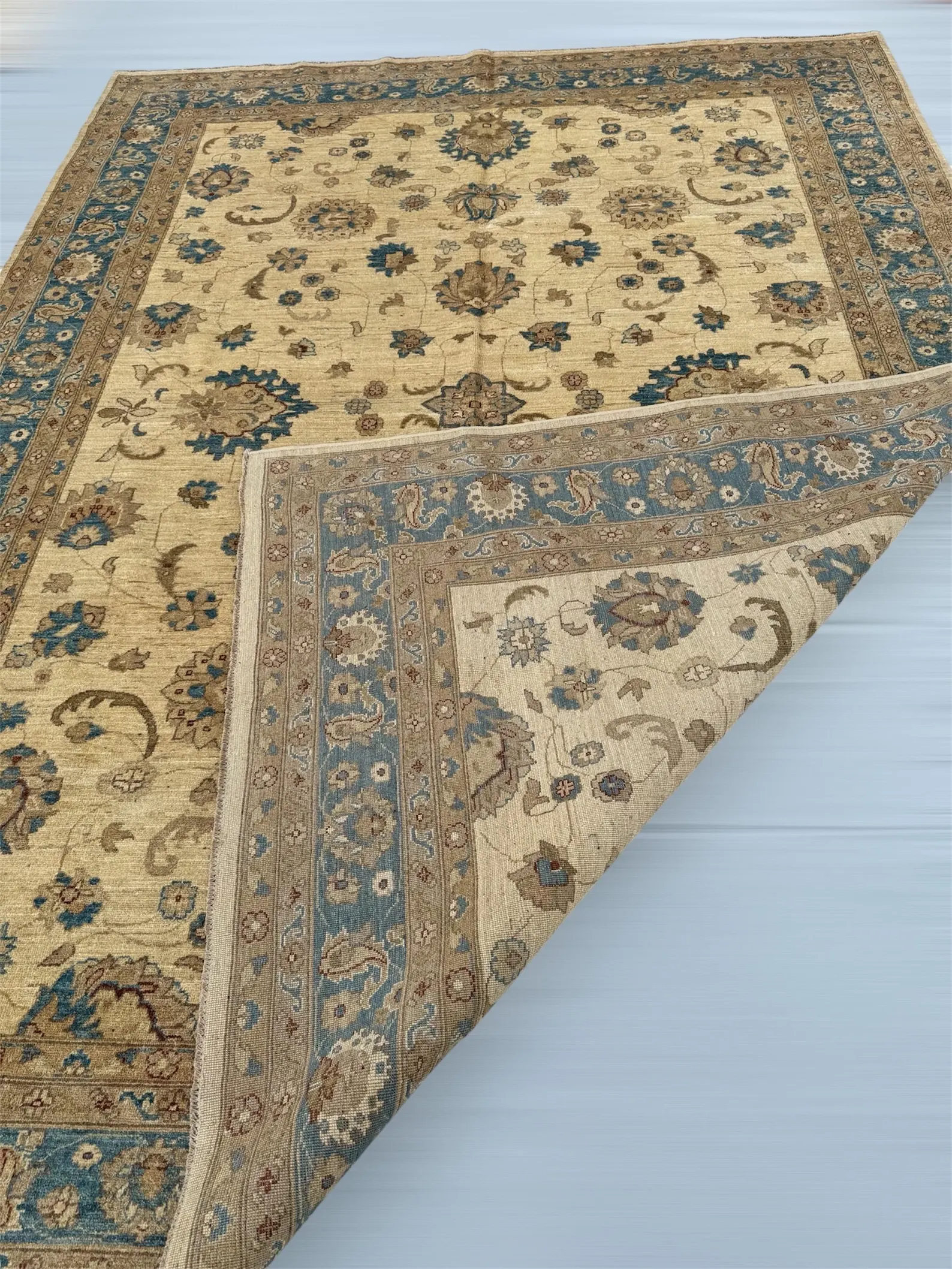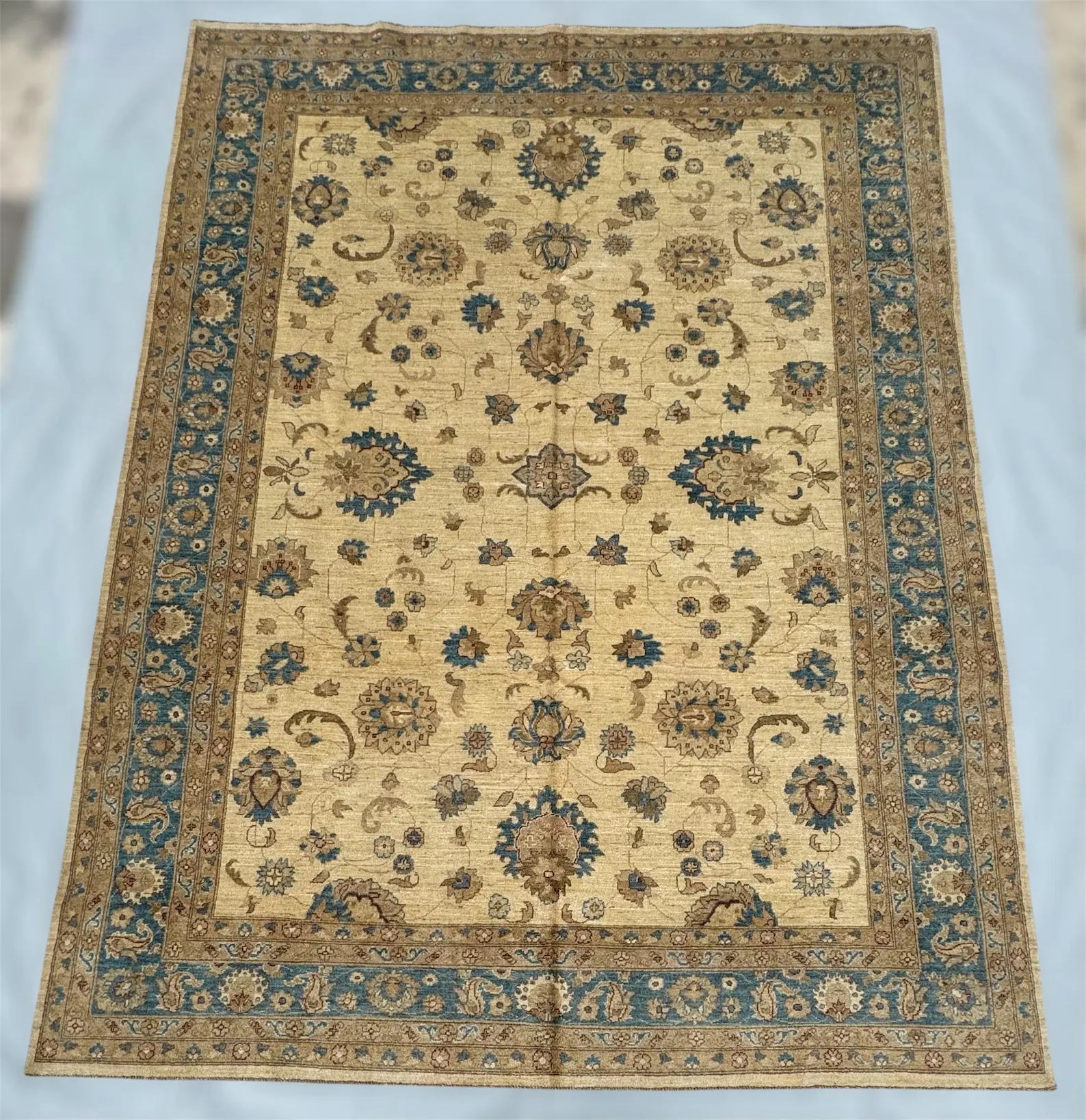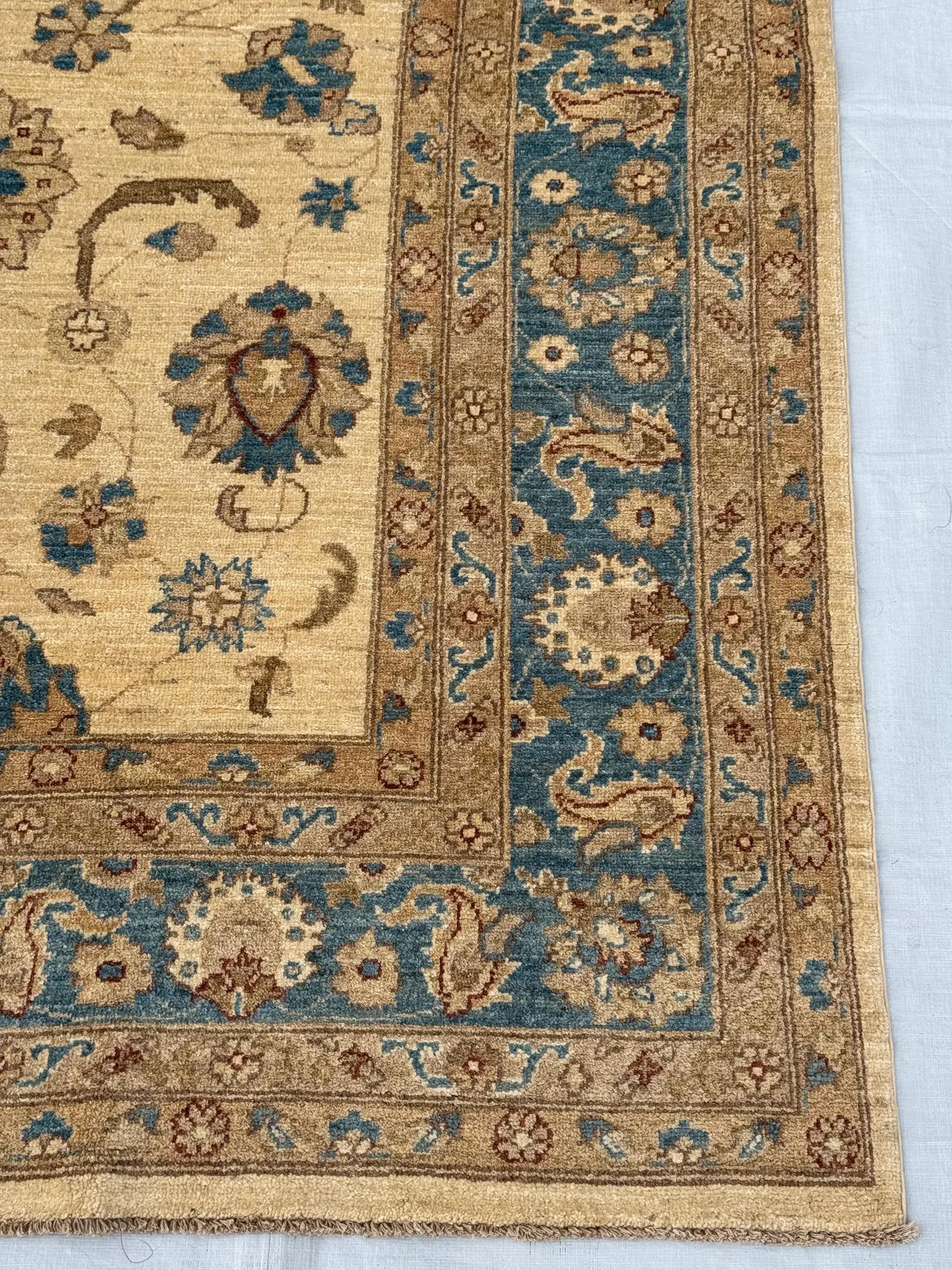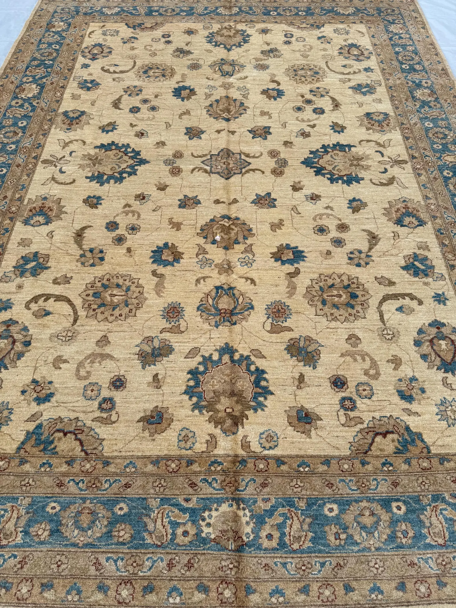 Add timeless elegance to your home with this large Afghan Chobi rug. Hand-knotted from 100% wool, it features a soft beige base, intricate floral patterns, and a striking blue border — perfect for vintage, rustic, or farmhouse interiors.