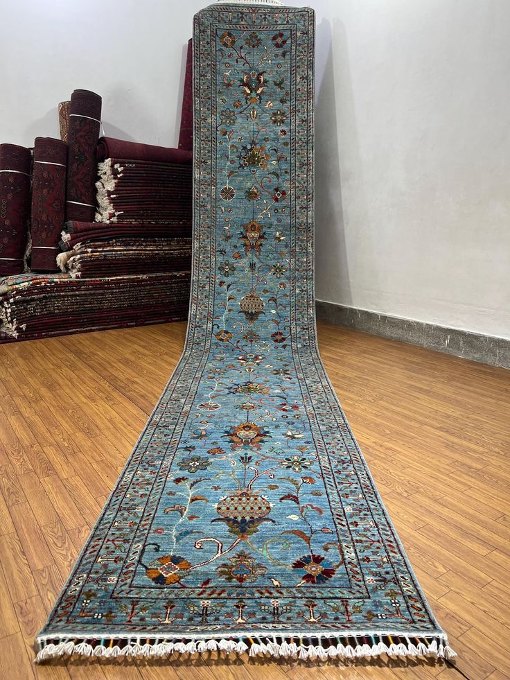 This exquisite 3×14 ft handmade Afghan runner rug is a true work of art. Crafted from 100% top-quality natural wool using traditional techniques, it features a rich blue Sultani base adorned with delicate floral Chobi Waziri designs. Each knot, ranging from 100 to 110 KPSI, reflects generations of skill and dedication, making it not just a rug but a symbol of Afghan resilience and craftsmanship.