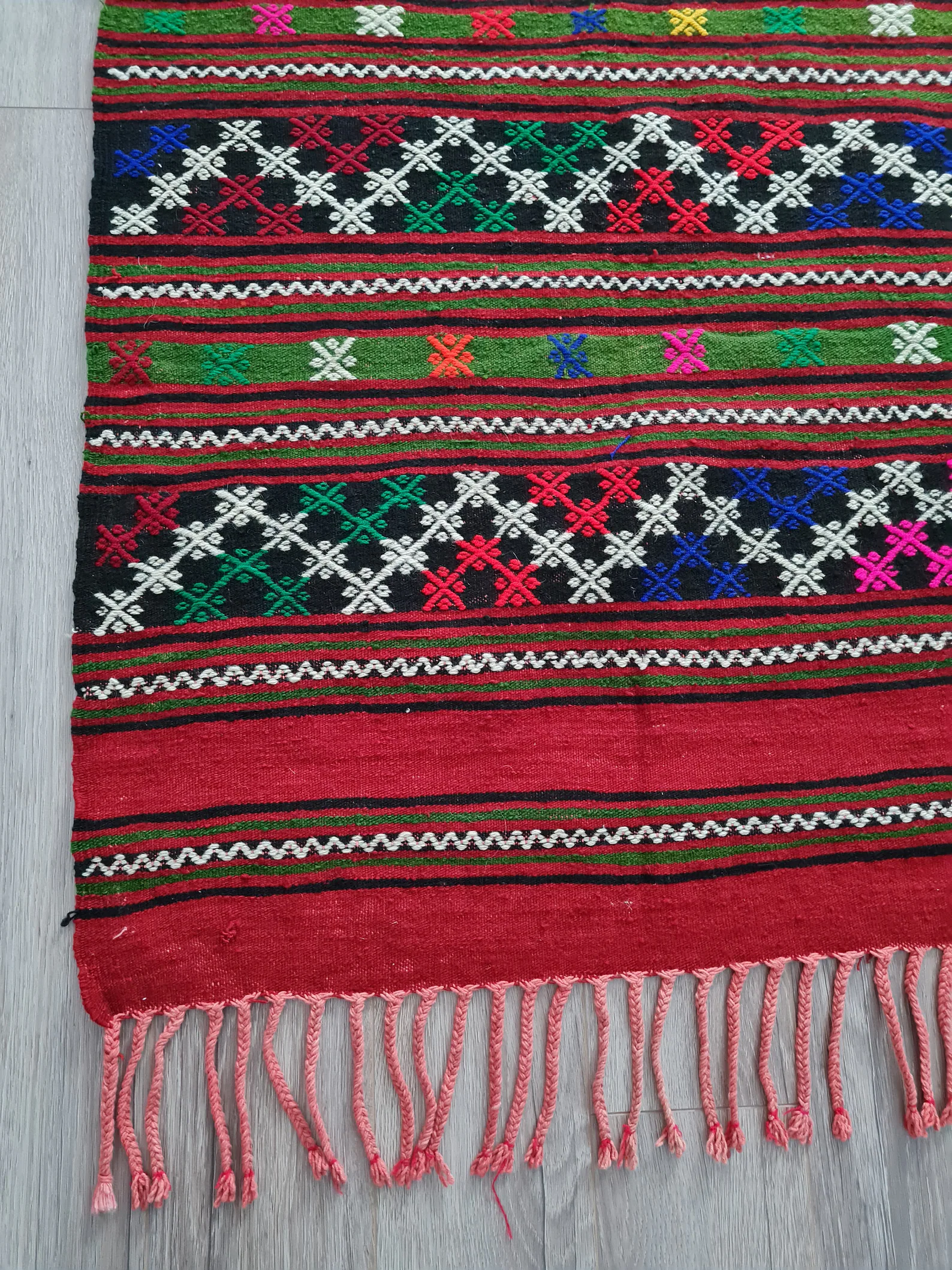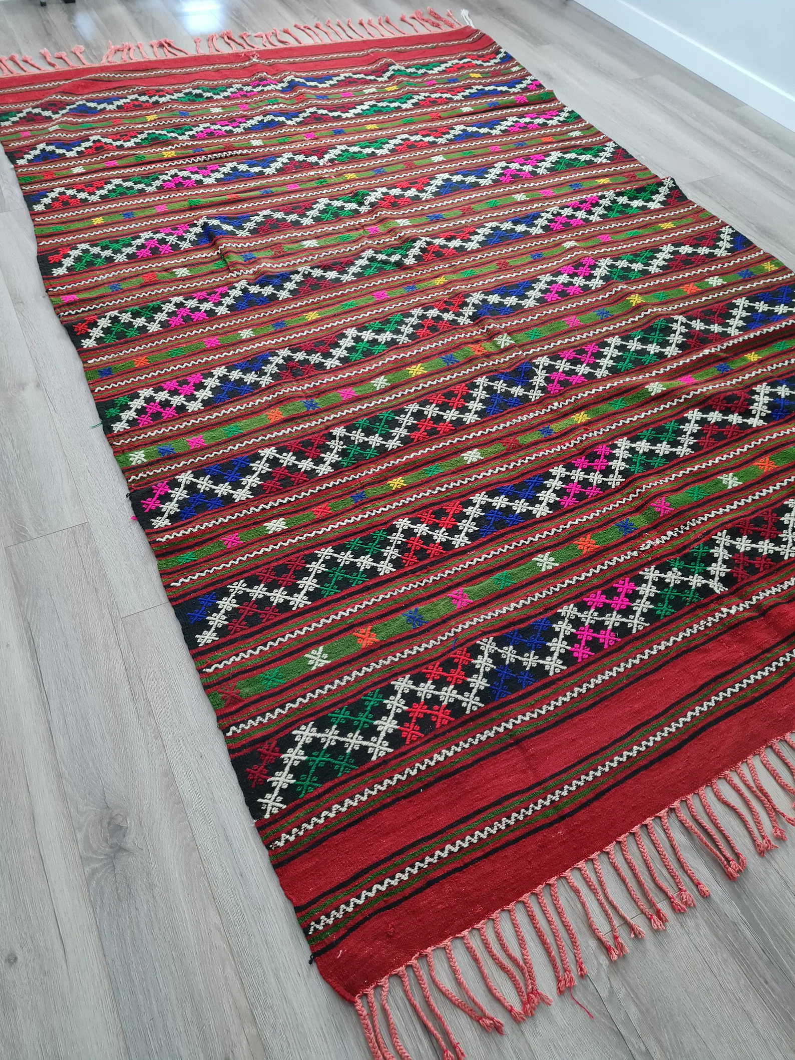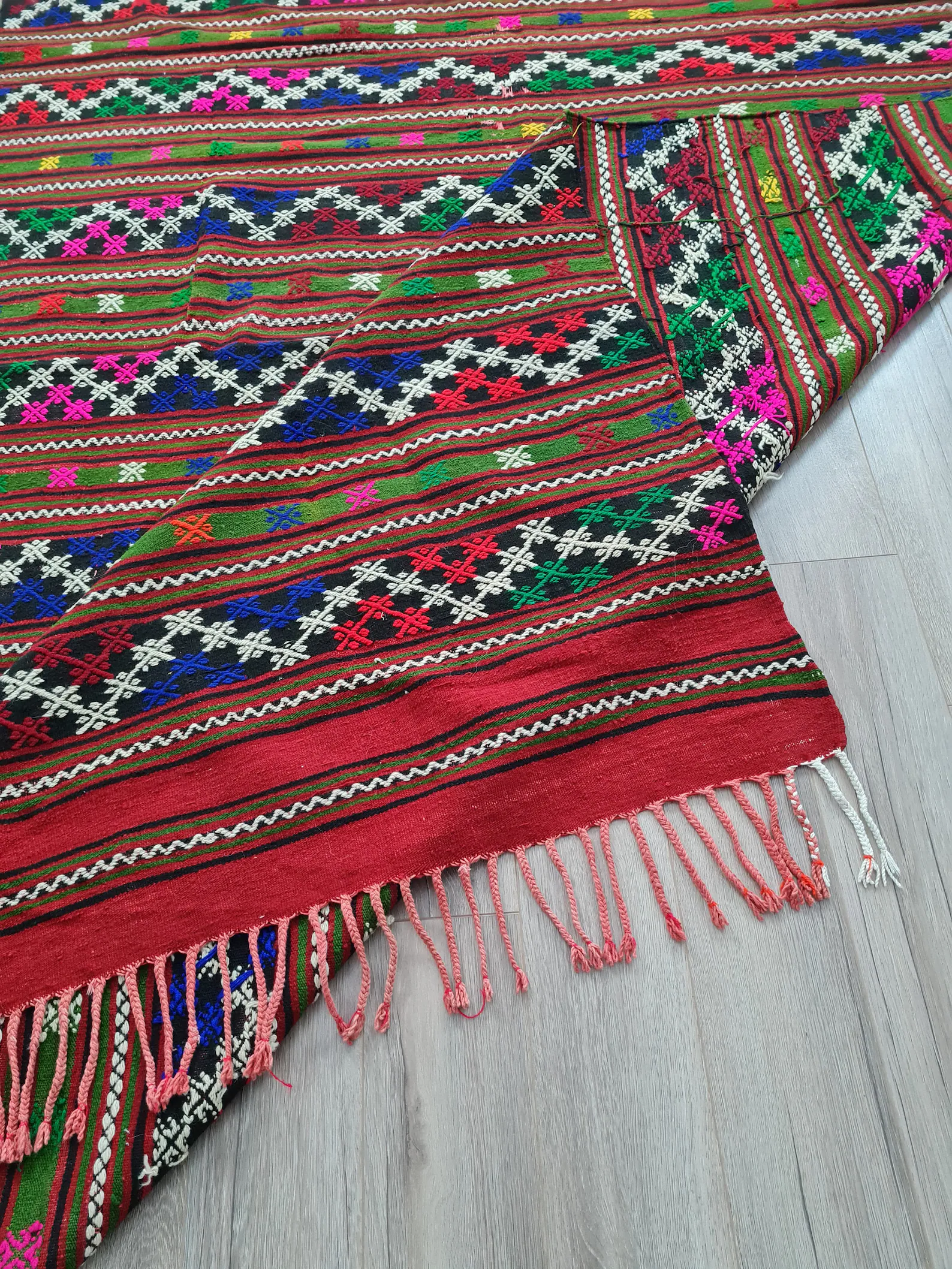 Bring timeless beauty and craftsmanship into your home with this authentic 1970s Anatolian kilim rug, handmade in Balıkesir, Türkiye. This stunning vintage piece was woven by local villagers on traditional looms, using hand-spun organic wool and natural plant-based dyes — a true testament to Turkish weaving heritage.